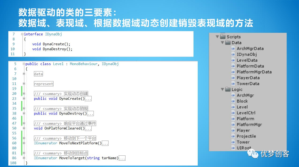 上图中下面的代码块是一个关卡对象,它在进入游戏时会创建,退出游戏时会被销毁,因为它实现了IDynaObj接口,这个接口中定义了两个规范:这个对象必须要能动态创建和这个对象必须要能动态销毁