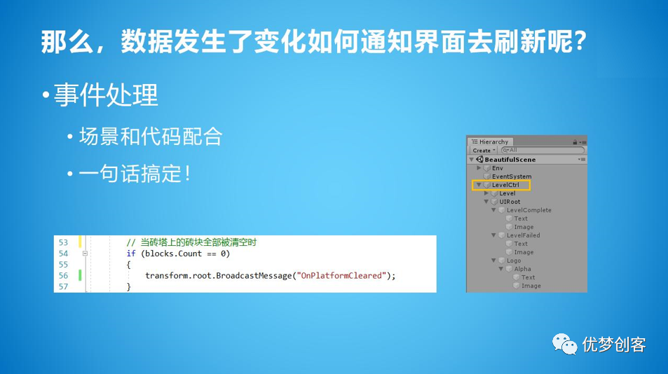 可以把整个场景中所有的元素都放在一个根结点下面,然后只需要在脚本中写下上图中的代码,就能让根结点广播一条消息,这条消息只会往发送消息对象的所有子节点发送,这样关卡里的每一个对象都能收到消息
