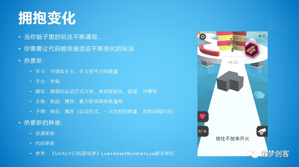 其实这也是一个游戏成败的关键,要让代码能够快速适应不断变化的玩法可以加入热更新,现在比较流行热更新方案有三种