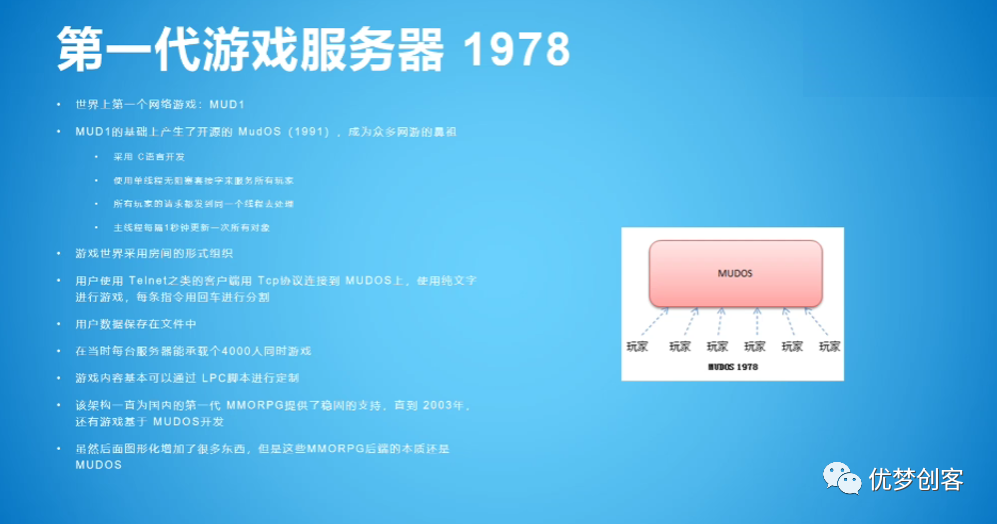 MUD1是由1978年英国某著名财经学校的学生编写的,并在1980年时将MUD1接入到了一个类似于现在的internet的网络里