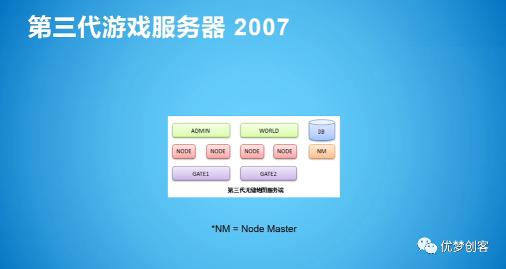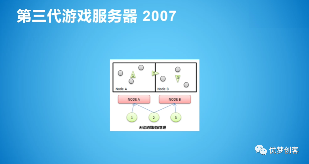 第三代的游戏服务器的普及是从2007年开始的,也可以说是从《魔兽世界》开始,那时无缝的游戏世界地图已经深入人心了,在之前的游戏里玩家走几步就要切换场景,每次切换场景都要加载几十秒,这是非常破坏游戏体验的,所以从2005年以后的大型的MMO开始,无缝地图就成为了标配