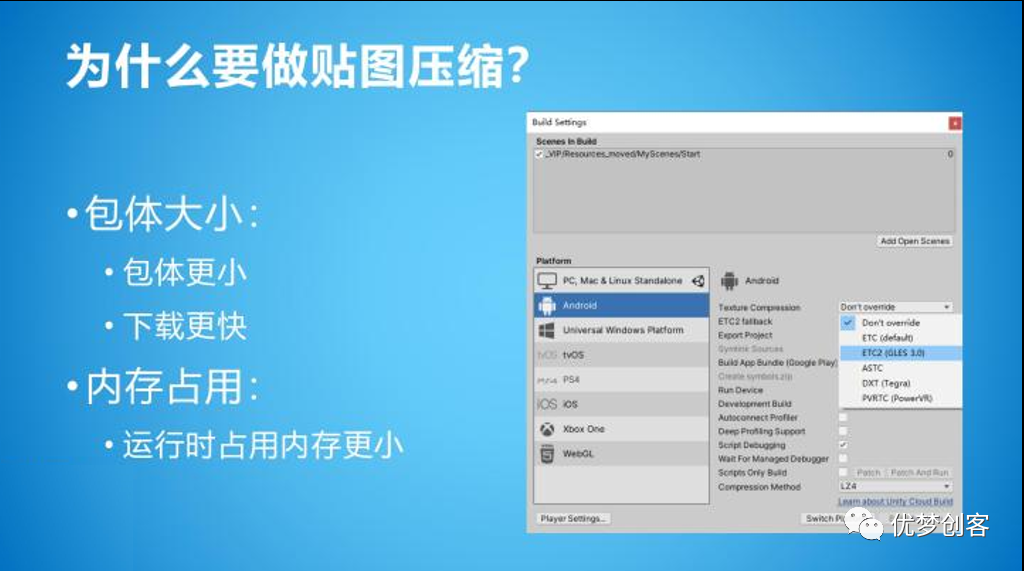 比如上面说的ETC2格式如果不是用在安卓平台,而是Windows平台,那么由于Windows平台不支持ECT2格式的硬件解压,那么它就需要先解压到内存,这个解压过程是消耗内存的,并且由于它是从ETC2的压缩格式转换到非压缩格式,中间会产生很多解压带来的开销