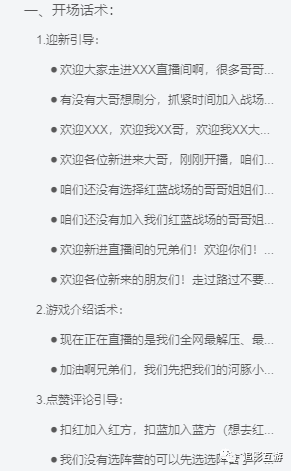 当然这肯定是不够的,以【双方阵营实时对战pk】这类弹幕游戏中目前最为火爆的“萌宠宠之战”为例,给大家整理了一套完整的既能留住大哥,又能创造高流水的弹幕游戏直播话术。