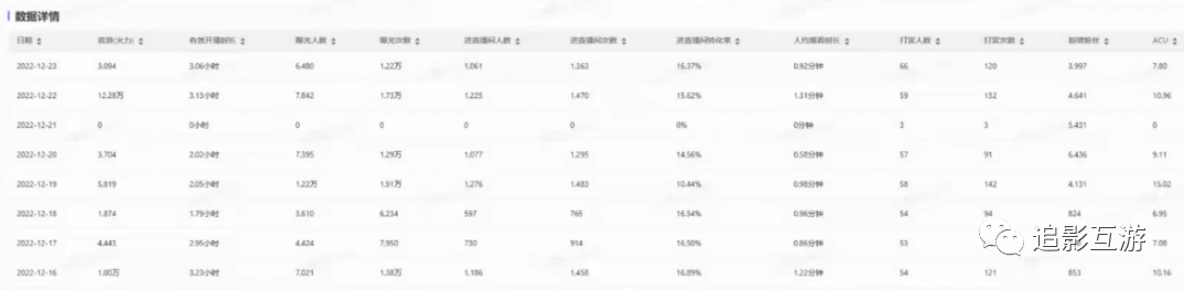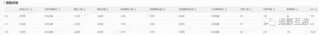 对比11和12日,平均在线人数只有6.15和7.19,可以看到曝光人数下降了很多,差不多一倍,只有1.9万和1.5万的曝光人数。