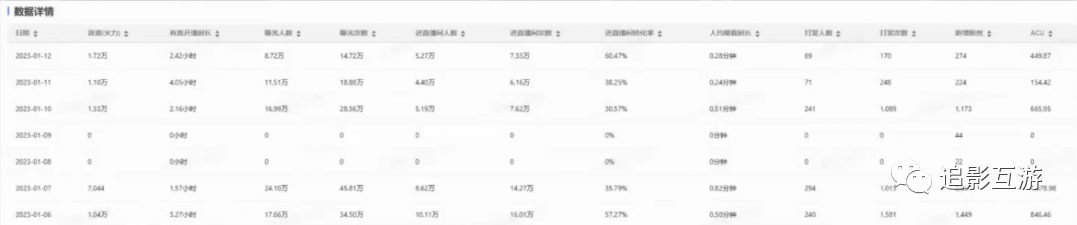 ACU 就是平均在线人数,就是主播当天平均在线有多少,1月10号的平均在线人数是11.46,对应的曝光人数是4.24万。