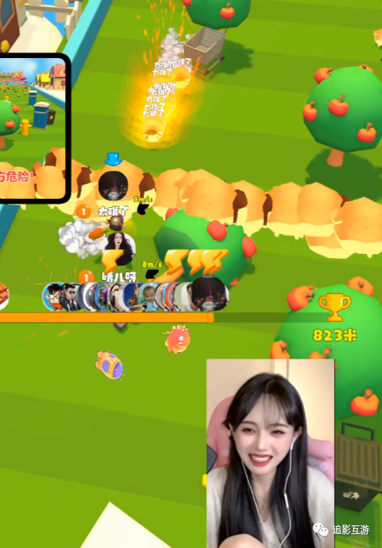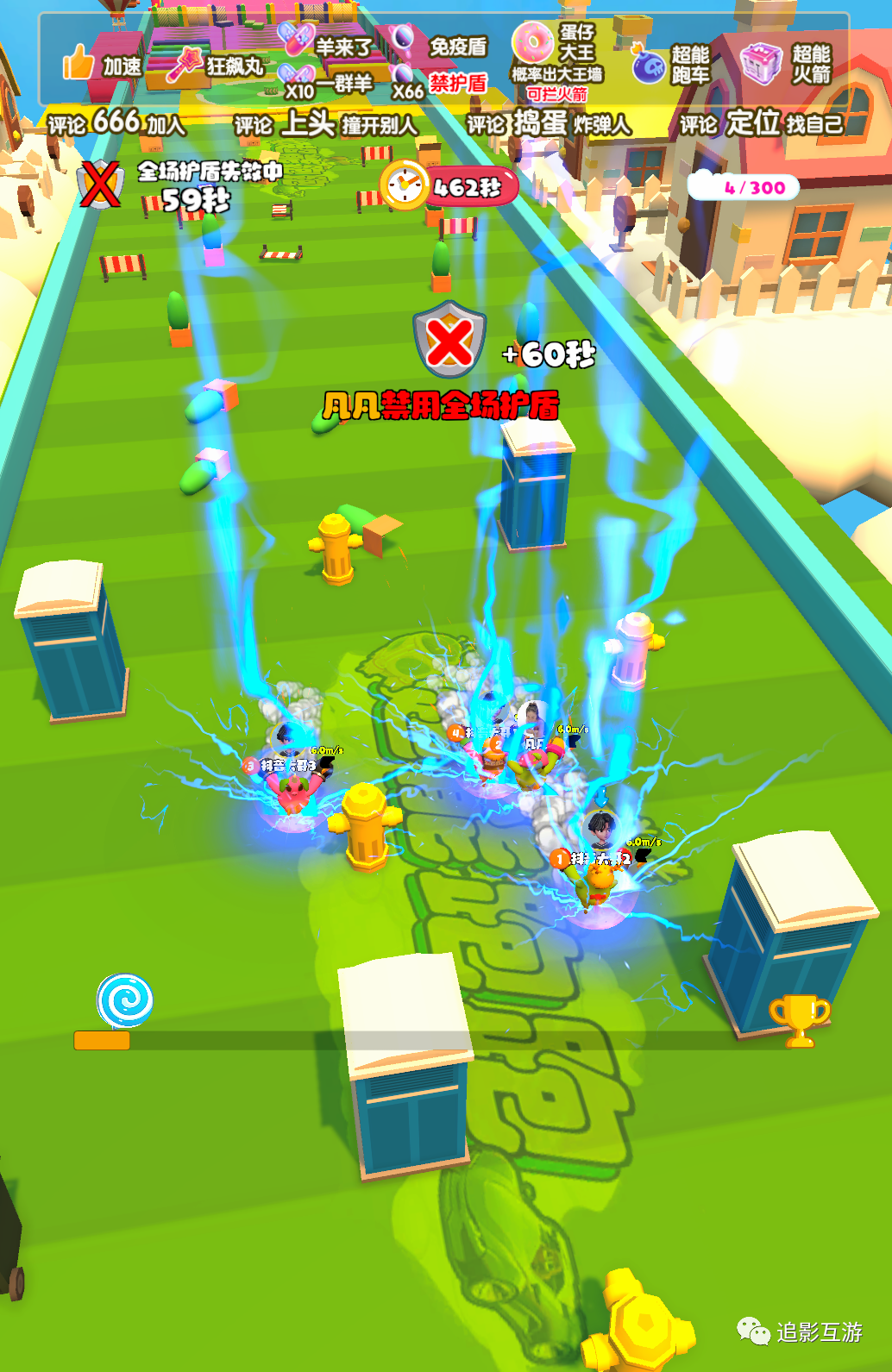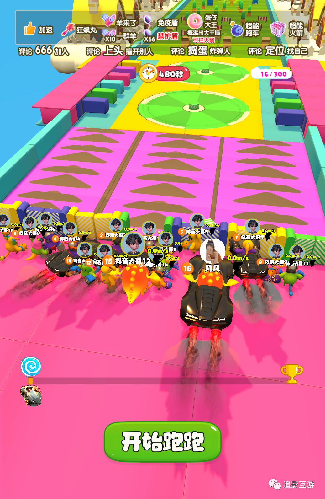过程中会遇到多个趣味关卡和道具,玩家通过评论&点赞、礼物加速奔跑、减速其他角色,最终目标是到达终点。