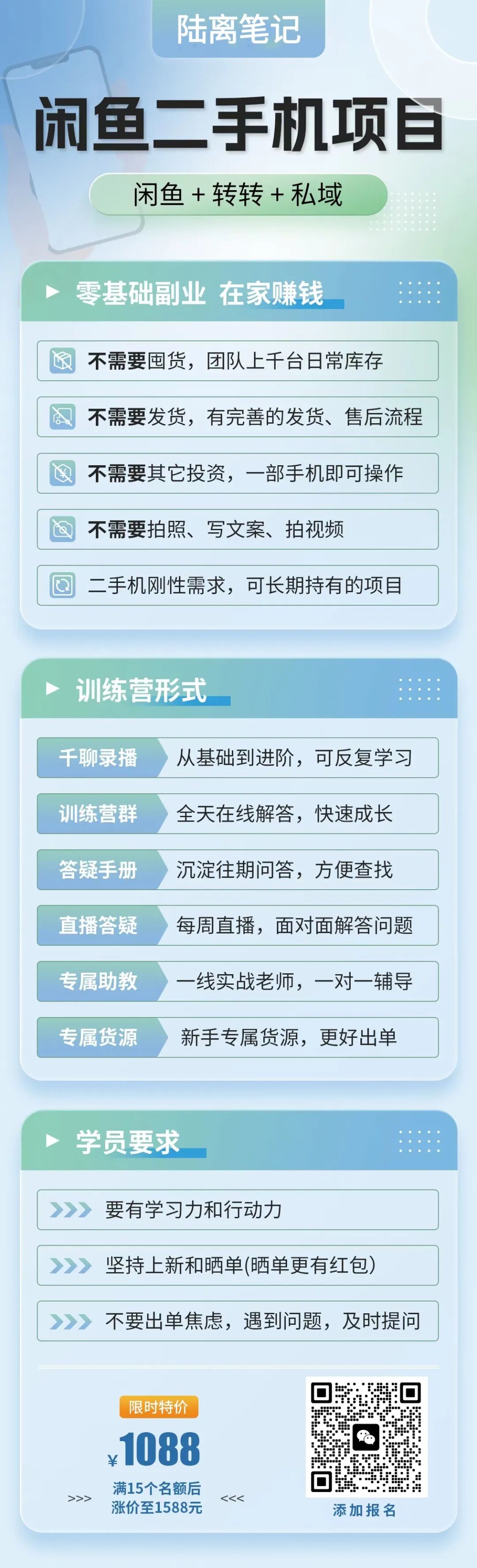 对于闲鱼,我也想研究这方面,测试熟练后带学员,但时间和精力有限,更重要的是,做二手手机,货源和团队要求非常有门槛,所以与专业团队合作,为学员带来合适的项目,培训学员,让学员可以完全掌握闲鱼二手机项目,获得稳定的收入。