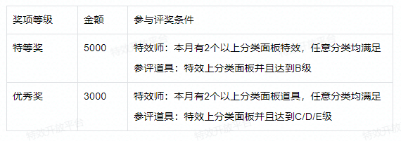 每两个月平台会评选出一部分制作精良、创意丰富、市场稀缺的特效给予加成奖励,特效评选所得奖金将在特效投稿奖励上叠加,即可同时获得奖金。