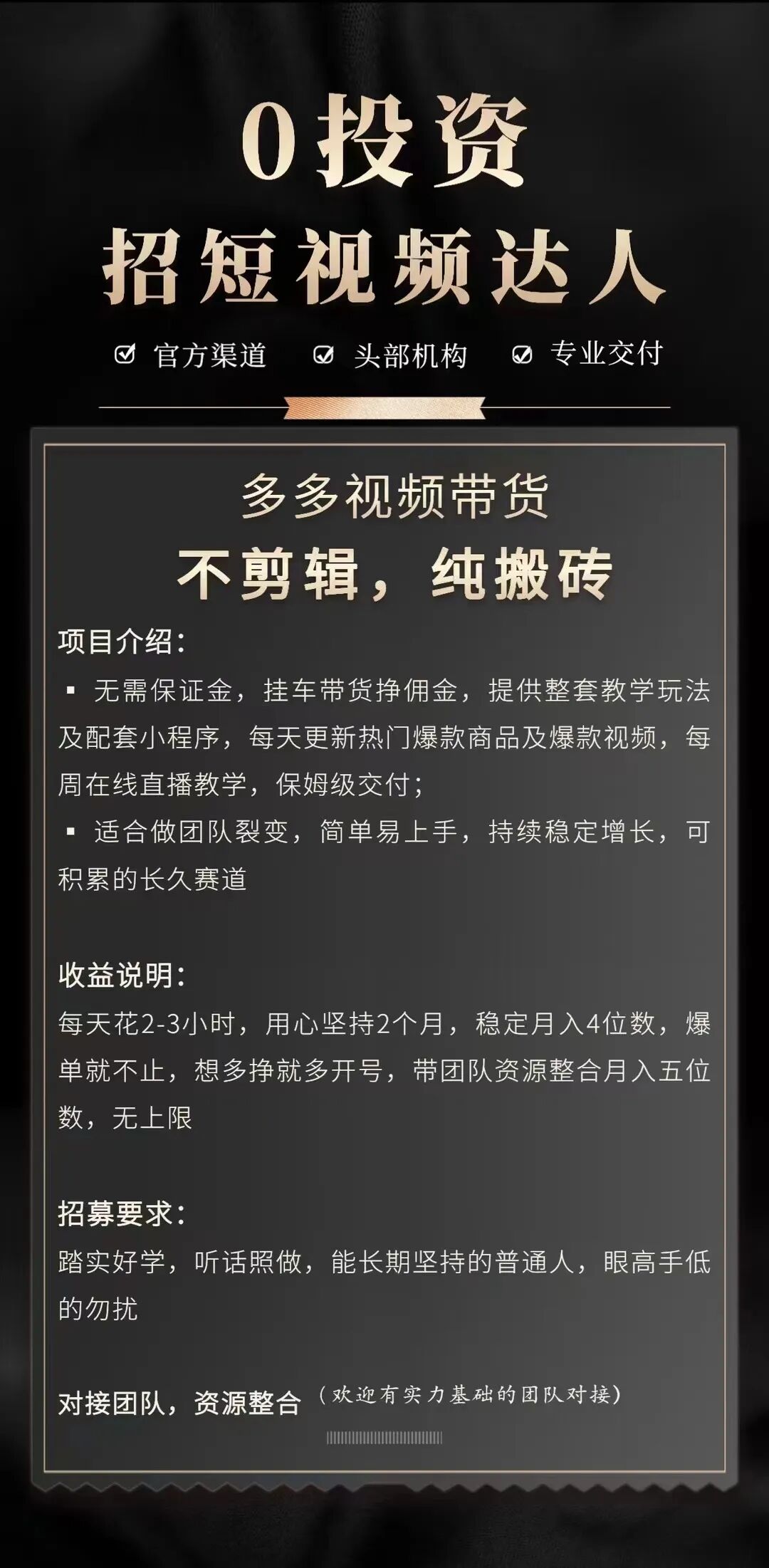 这是项目介绍(现在加入不收199押金,免押金,免费带):月入5000+,矩阵操作多多视频带货项目,适合新手,也适合老手放大