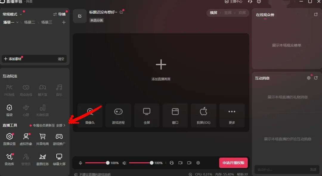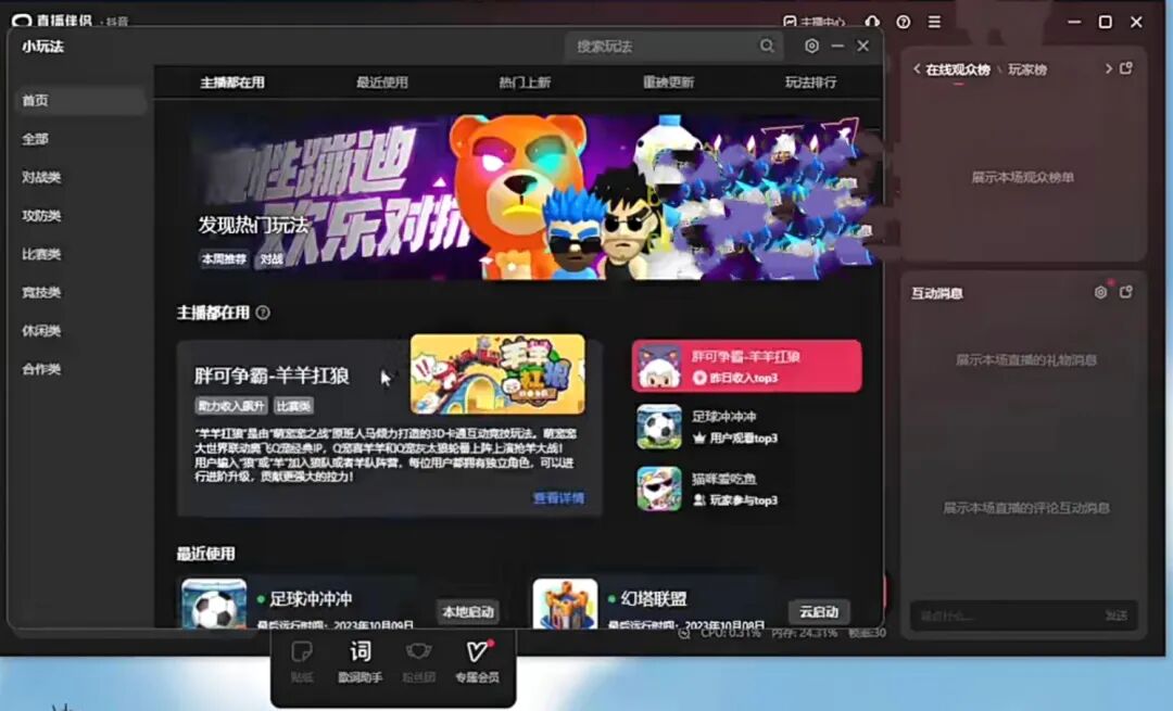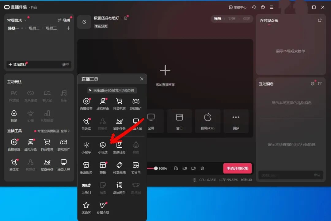 首先第一步先下载直播伴侣(不知道怎么下载的我这边会提供)第二,用自己的抖音号扫描直播伴侣进入。第三,点里面的直播工具旁边的全部,然后点击小玩法。