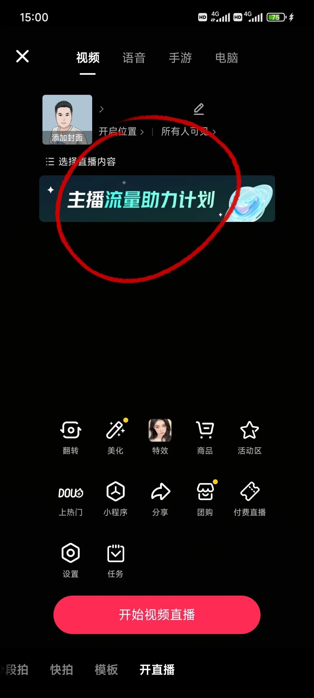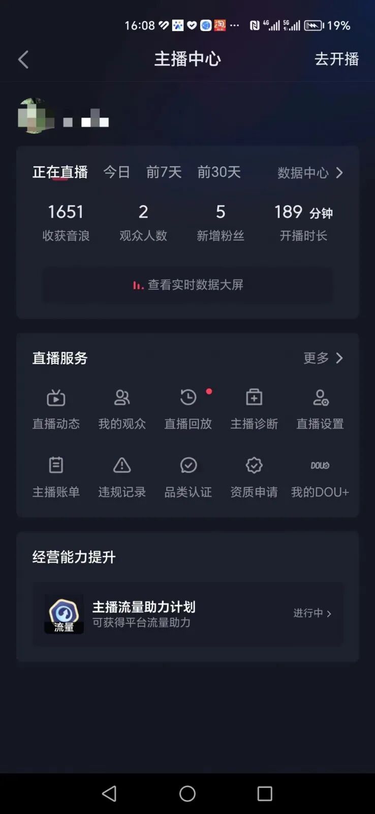 上图这样就是正常的,如果打开是黑屏的话就直接关闭重新打开,直到直播伴侣出现画面就可以了。在直播前先用手机打开抖音,点+号选择开直播,下面有个主播流量助力计划,填了之后新人会有流量扶持。