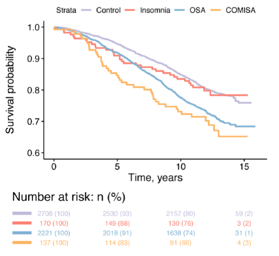 在该研究中,研究人员分析了一个包含5236人的大型美国数据集,以了解同时患有失眠症和阻塞性睡眠呼吸暂停症(COMISA)的风险。参与者在研究开始时年龄在60岁左右,52%是女性,随访了大约15年,在此期间有1210人死亡。