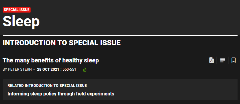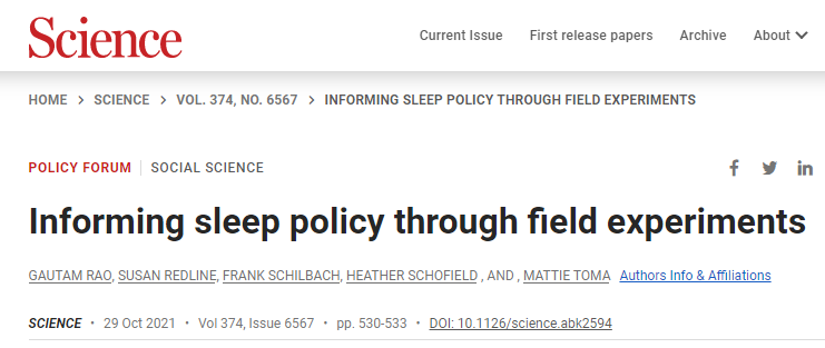 2021年10月29日,美国哈佛大学和麻省理工学院的研究人员在" Science "期刊发表了一篇题为" Informing sleep policy through field experiments "的研究论文。