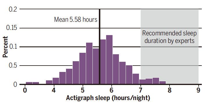 通过睡眠记录时间发现,参与者夜间睡眠持续时间和效率低于富裕国家的水平。具体来说,参与者平均每晚只睡5.6小时,平均睡眠效率只有70%。此外,71%的参与者平均每晚睡眠少于6小时。