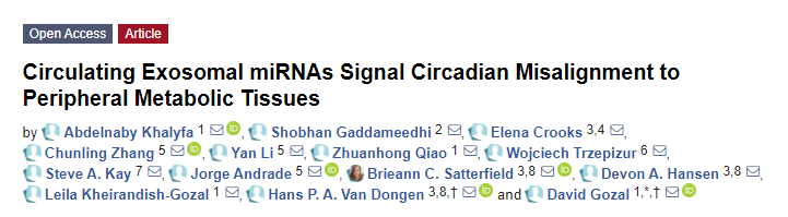 2020年9月,密苏里大学医学院的研究人员在" International Journal of Molecular Sciences "上在线发表了题为"Circulating Exosomal miRNAs Signal Circadian Misalignment to Peripheral Metabolic Tissues"的研究报告,该研究发现了夜班工作期间代谢变化的潜在原因,这种变化导致体内细胞与大脑中央时钟之间产生混乱。