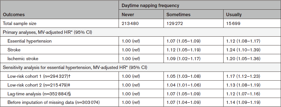 在该研究中,研究人员分析了 UK Biobank 数据库中约360000名参与者午睡与首次报告中风或高血压之间的关联,参与者年龄在40-69岁之间,并对参与者进行了4次白天午睡频率调查,午睡频率分为3组:从不/很少、有时、经常。