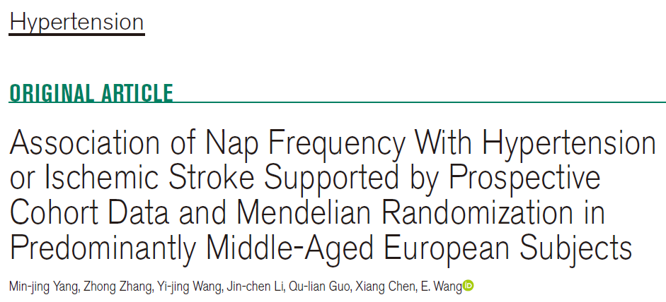 近日,中南大学湘雅医院王锷教授团队在国际权威高血压病期刊" Hypertension "上发表了一篇题为" Association of nap frequency with hypertension or ischemic stroke supported by prospective cohort data and Mendelian randomization in predominantly middle-aged European subjects "的研究论文。