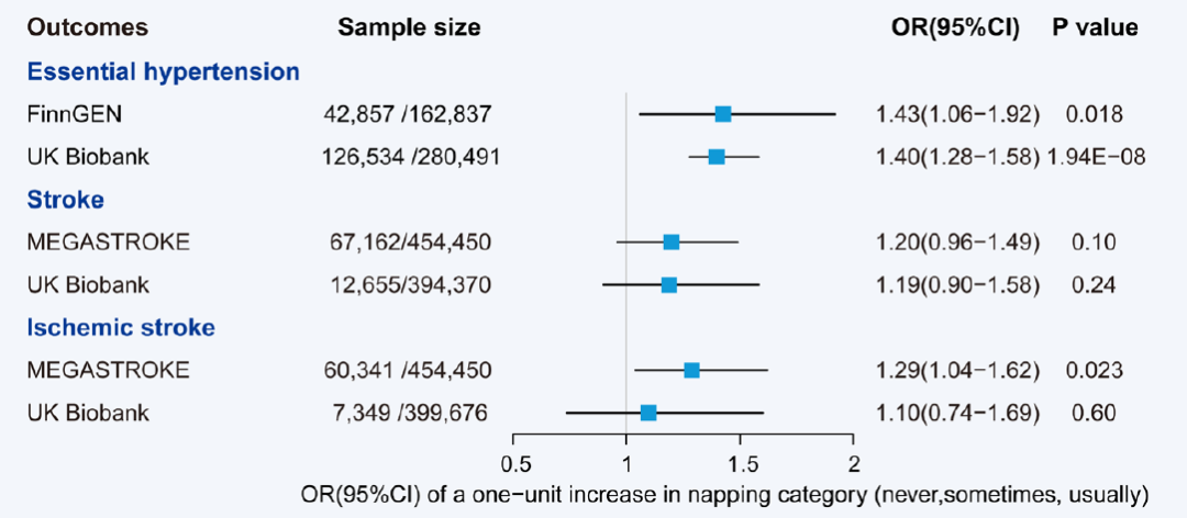 此外,在整个研究过程中,大约75%的参与者保持相同的午睡类型。孟德尔随机化结果表明,如果午睡频率增加一个类别(从有时到经常),高血压风险增加40%,较高的午睡频率与高血压风险的遗传倾向有关。
