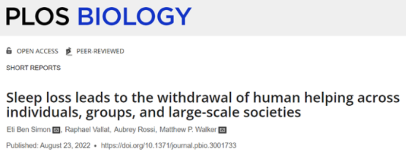 2022年8月23日,美国加州大学的研究人员在" PLOS Biology "期刊上发表了一篇题为" Sleep loss leads to the withdrawal of human helping across individuals,groups,and large-scale societies "的研究论文。