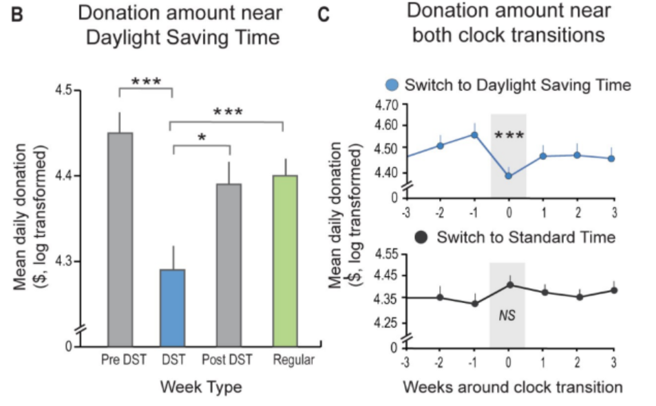 研究发现,在夏令时开始后的一周内,当大多数居民失去一天中的一小时时,慈善捐赠下降了10%。