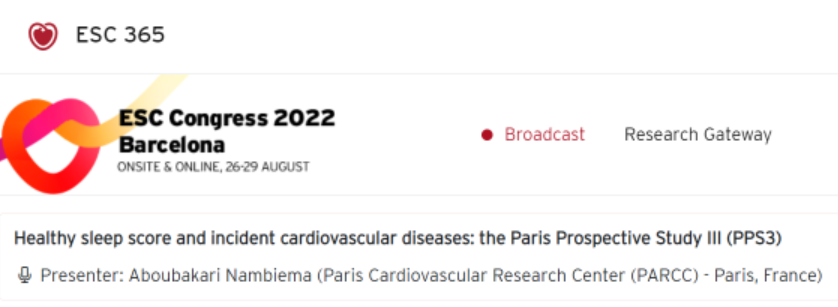 2022年8月26日,法国国家健康与医学研究所的研究人员在2022年《欧洲心脏病学会》ESC大会上发表了一项题为" Healthy sleep score and incident cardiovascular diseases: the Paris Prospective Study III (PPS3) "的研究。