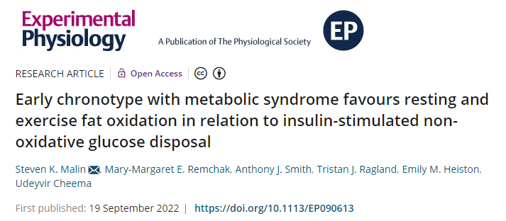 2022年9月19日,美国罗格斯大学的研究人员在" Experimental Physiology "期刊上发表了一篇题为" Early chronotype with metabolic syndrome favours resting and exercise fat oxidation in relation to insulin-stimulated non-oxidative glucose disposal "的研究论文。