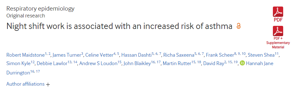 2020年11月16日,英国曼彻斯特大学的研究人员在 BMJ 子刊" Thorax "上在线发表了题为"Night shift work is associated with an increased risk of asthma"的研究,该研究表明,轮班工人或者经常上夜班的人,处于中度至重度哮喘的风险可能更高。