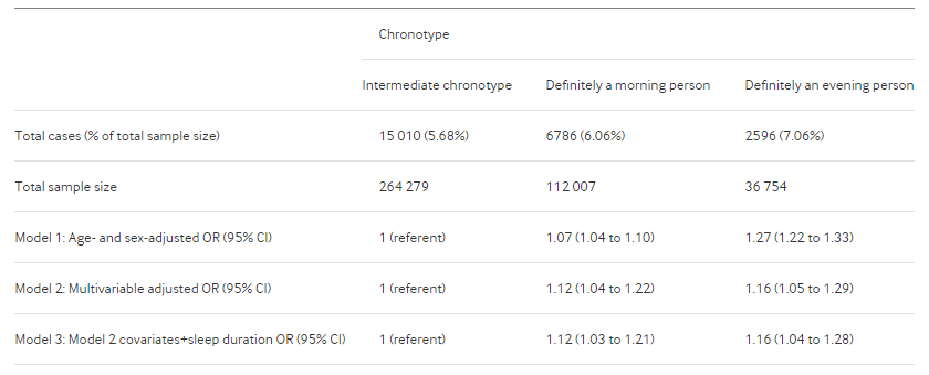 该研究分析了2007年至2010年间英国生物库中286825名参与者,所有这些参与者年龄在37至72岁之间,大多数(83%)的工作时间为常规办公时间,而17%的工作为轮班,其中大约一半(51%)包括夜班。轮班模式有3种:从不或偶尔有夜班、不定期或轮换的夜班、和永久夜班。
