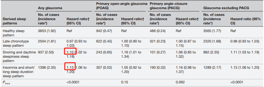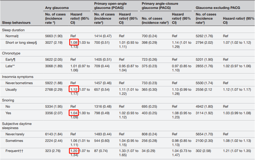 在该研究中,研究人员分析了 UK Biobank 数据库中409053名参与者数据,年龄在40-69岁之间,通过参与者的睡眠行为的详细信息,分析了睡眠持续时间、失眠、熬夜型或早起型、白天嗜睡、打鼾与患青光眼的关系。