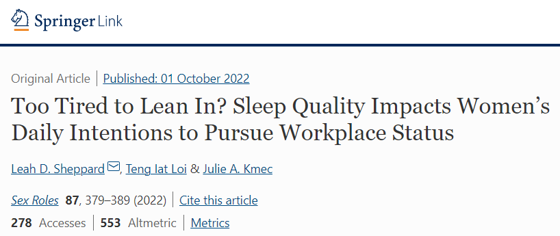 近日,美国华盛顿州立大学的研究人员在" Sex Roles "期刊上发表了一篇题为" Too Tired to Lean In? Sleep Quality Impacts Women’s Daily Intentions to Pursue Workplace Status "的研究论文。