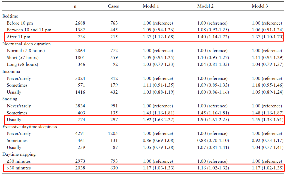 在该研究中,研究人员分析了5011名中国成年人自我报告的睡眠数据,1423例被确诊为脂肪肝。入睡时间分为3组:晚上10点前、10-11点之间、11点后。夜间睡眠时间分为3组:短(<7小时)、正常(7-8小时)和长(>8小时)。根据出现次数评估失眠、打鼾和白天过度嗜睡程度。午睡时长分为每天0-30分钟和超过30分钟。