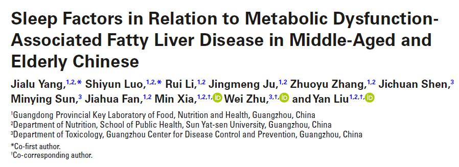 近日,中山大学夏敏教授和柳雁副教授、广州市疾控中心朱伟在《临床内分泌与代谢》" JCEM "期刊上发表了一篇题为" Sleep Factors in Relation to Metabolic Dysfunction-Associated Fatty Liver Disease in Middle-Aged and Elderly Chinese Get access Arrow "的研究论文。