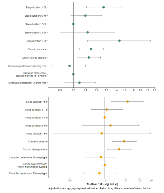 不仅如此,睡眠时间小于6小时或大于9小时的人,以及存在慢性睡眠问题的人,还增加胃肠道感染风险。失眠参与者还增加尿路感染风险。