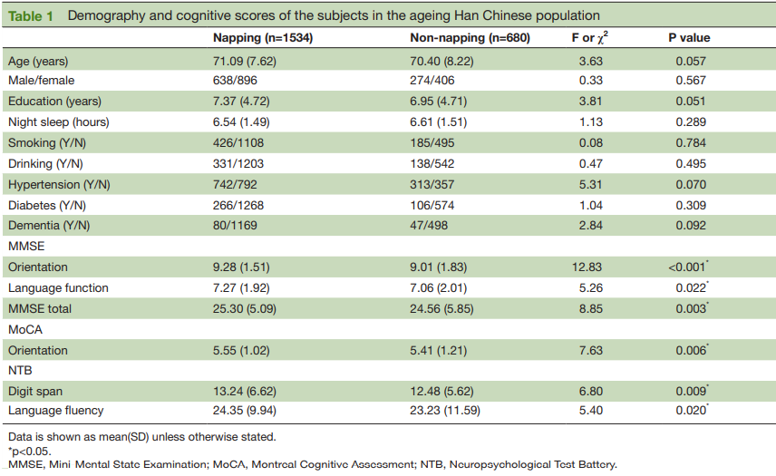总共有1534人有规律地午睡,680人没有。所有参与者都接受了一系列的健康检查和认知评估,包括检查痴呆症的简易精神状态检查(MMSE)。