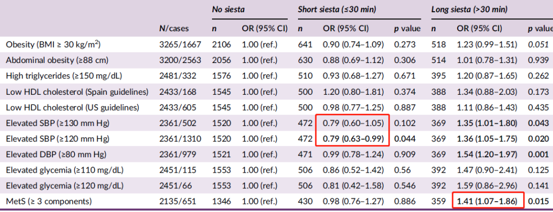 在该研究中,研究人员分析了来自地中海的3275名成年参与者,年龄在18-65岁之间,平均BMI为31,但基线时均未患代谢综合征,基线时,研究人员测量了参与者的一般特征以及代谢状态,还收集了参与者的午睡和生活方式因素信息,分析了午睡与代谢综合征之间的关系。