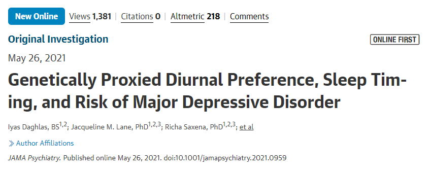 2021年5月26日,哈佛大学和麻省理工学院的研究人员在" JAMA Psychiatry "期刊上发表了一篇题为"Genetically Proxied Diurnal Preference, Sleep Timing, and Risk of Major Depressive Disorder"的研究论文。