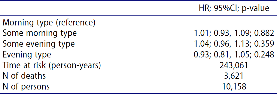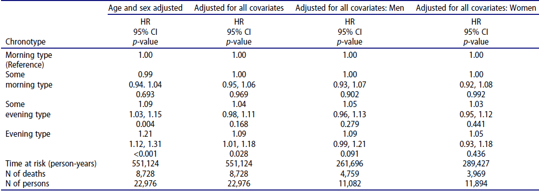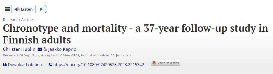 近日,芬兰职业健康研究所的研究人员在《国际时间生物学》期刊上发表了一篇题为" Chronotype and mortality - a 37-year follow-up study in Finnish adults "的研究论文。