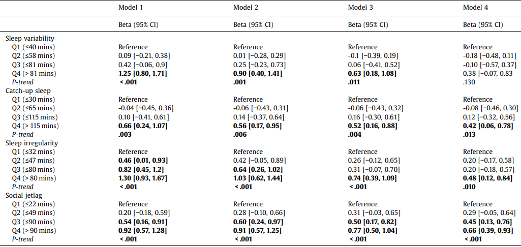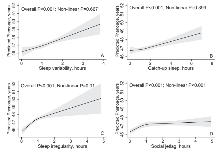 具体来讲,与保持稳定的睡眠习惯的人相比,睡眠持续时间不稳定、补觉较多、入睡时间偏差较大、工作日和周末睡眠差异大的参与者,生物年龄分别大0.63年、0.52年、0.74年和0.77年。