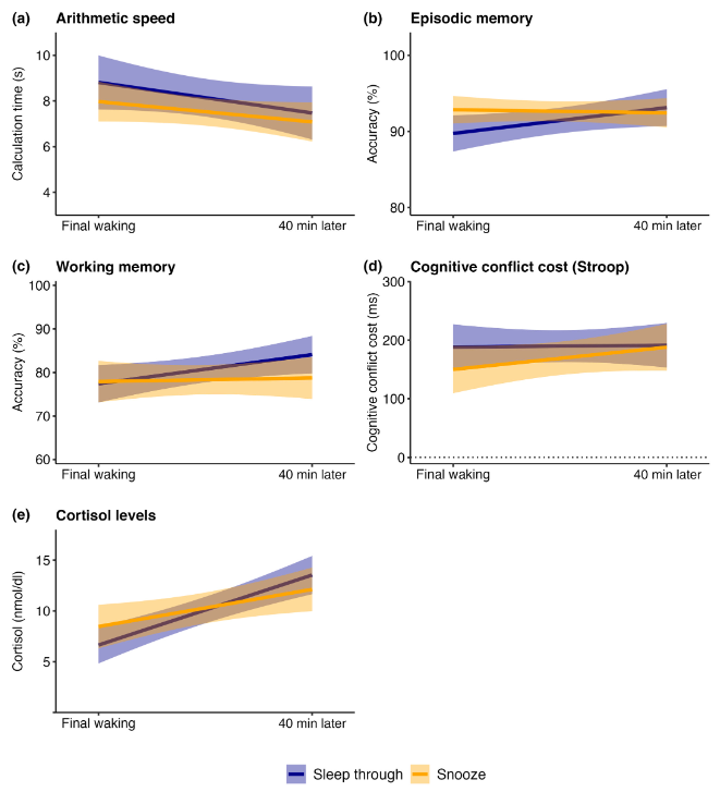 在研究2中,研究人员对31名早上习惯性贪睡的人进行了实验,对参与者进行了不同类型的闹钟实验,测量了参与者的睡眠质量、认知能力、皮质醇水平和情绪状态,认知测试包括:算术速度、情景记忆、工作记忆和认知冲突处理。