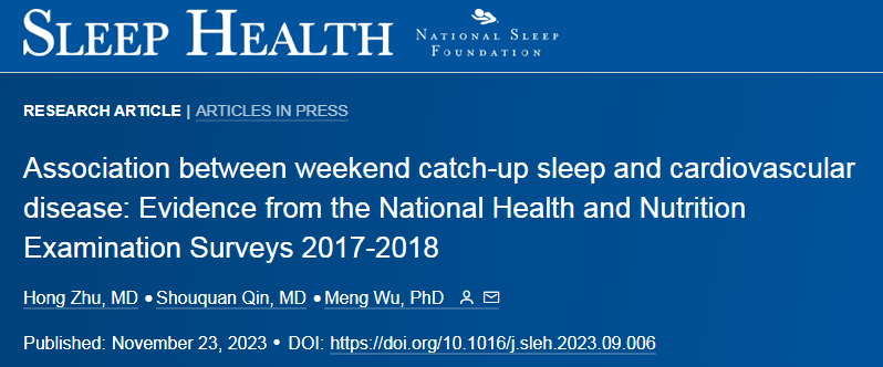 近日,南京医科大学附属淮安市第一人民医院的研究人员在" Sleep Health "期刊上发表了一篇题为" Association between weekend catch-up sleep and cardiovascular disease:Evidence from the National Health and Nutrition Examination Surveys 2017-2018 "的研究论文。