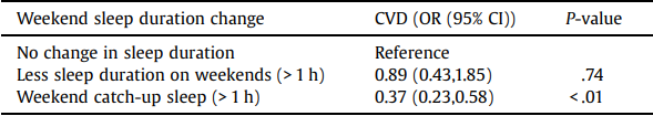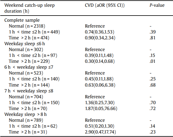 在这项研究中,研究人员分析了美国健康和营养检查调查(NHANES)队列中3400名成年参与者,其中333人患有心血管疾病(CVD),通过问卷形式收集了参与者的工作日和周末睡眠时长,研究分析了周末补觉与心血管疾病之间的关系。