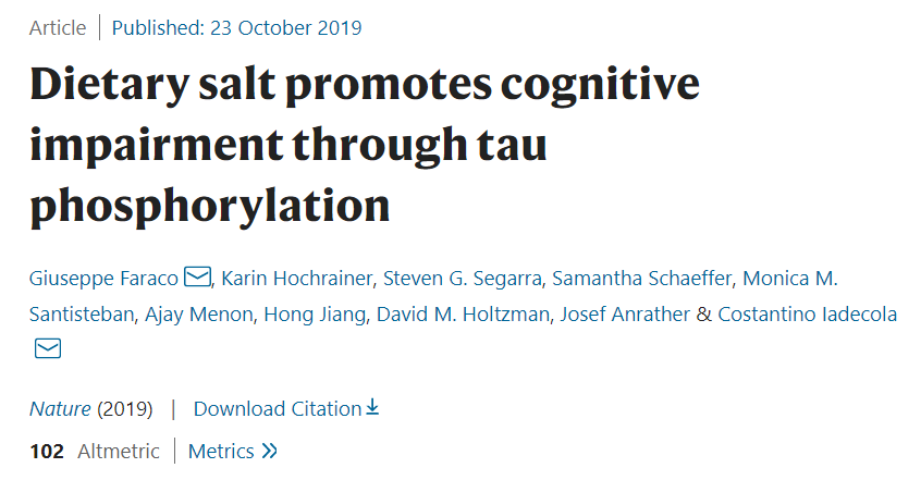 这项研究来自纽约威尔-康奈尔医学院科学团队,研究者们发现,高食盐摄入竟然会促进小鼠大脑中的tau蛋白磷酸化,进而导致认知障碍[1]!要知道这个tau蛋白可是和阿尔茨海默病等不少会导致痴呆的疾病有关,原来还真是“咸傻”的?