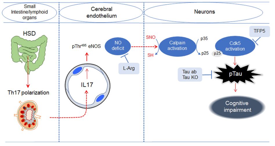 没看过不要紧,一起来复习一下:高食盐摄入会激活小鼠小肠内的TH17细胞,导致血液中白介素17(IL-17)水平增加,进而减少了大脑中内皮细胞产生的一氧化氮(NO),导致血管调节失衡,大脑血流量,最终小鼠发生了认知障碍[2]。