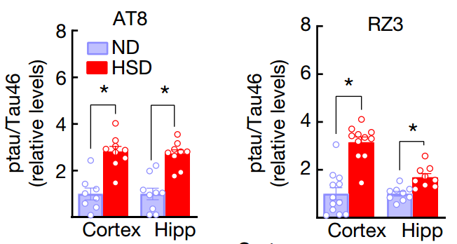 果不出所料,吃咸了的小鼠脑子里那叫一个乱套,随着实验的继续,大脑皮层和海马体中磷酸化tau蛋白(p-tau)水平不断增加,不过总tau蛋白的水平没有变。