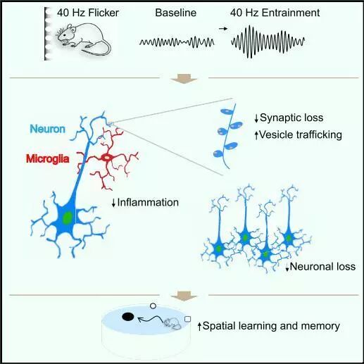 原来,40Hz的视觉刺激提高了小鼠大脑重要区域的γ波频率,缓解了AD小鼠的突触功能损伤,减少了小胶质细胞的炎症反应,提高小鼠的空间学习和记忆能力。