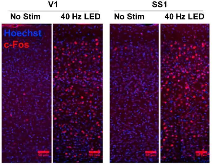 在40Hz的光照视觉刺激之下,野生型小鼠的视觉皮质(A1)、体感皮质(SS1)、海马区CA1、齿状回(DG)、前额皮质(PFC)等区域的神经元活动显著提高,γ波频率也显著增加。