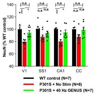 这次,研究人员使用的两种AD小鼠模型病情都比之前两次实验的小鼠模型要更加严重,但是,40Hz光照依然显著增强了大脑V1、CA1、PFC区域的γ波频率,并且,这些区域的神经元数量远高于没有经过治疗的AD小鼠,和野生型小鼠相差无几。