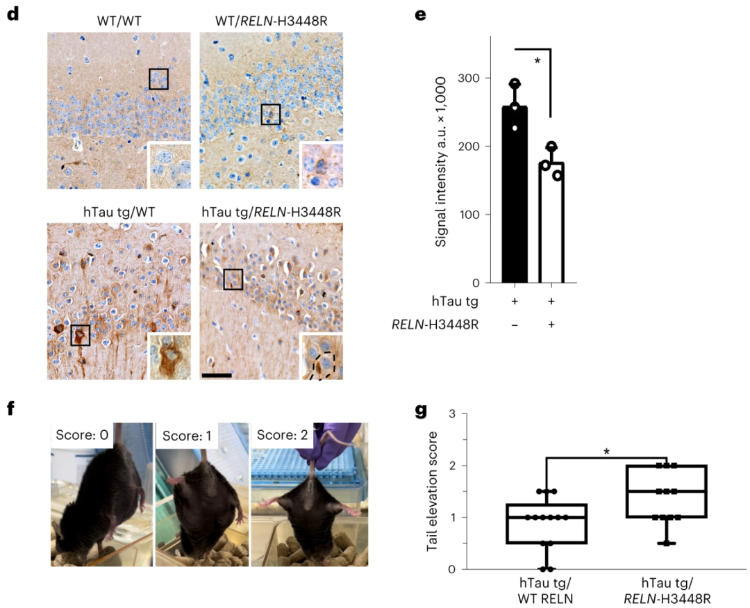 研究者还在tau病模式小鼠中进行了实验,STOCK Tg JNPL3Hlmc小鼠具有突变的tau基因,会自发产生tau缠结积累和特定脑区的神经元损失。转入RELN-COLBOS等位基因之后,雄性小鼠海马、延髓中的磷酸化tau蛋白显著减少,异常夹紧肢体等小鼠常见的tau病表现也得到了显著的恢复。