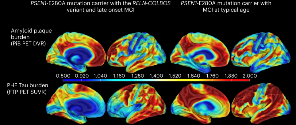 经过遗传分析,该男性患者是PSEN1 E280A杂合子携带者,APOE3/APOE3,并非APOECh携带者,但他具有一个罕见的杂合突变RELN H3447R,这个突变被研究者称为RELN-COLBOS。