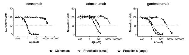 Lecanemab(BAN2401)是人源化IgG1抗体,可选择性与较大的可溶性Aβ原纤维结合。曾有研究者横向对比了Lecanemab、Aducanumab和Gantenerumab对Aβ各种形式聚合物的结合能力,结果显示Lecanemab结合75-300kD较小原纤维的亲和力是Gantenerumab的10倍、Aducanumab的100倍;对于300-500kD的较大的原纤维,Lecanemab亲和力则是Aducanumab的25倍[2]。
